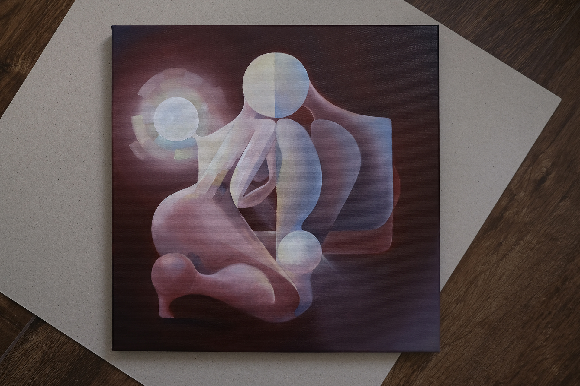 Through my geometric language, I explore the eternal dance between masculine and feminine energies under the moon's mystical influence. The foundation of the composition is built upon two opposing triangles that reflect the harmony between masculine and feminine principles. The circular forms represent the cyclical nature of lunar power, while the interconnected figures symbolize the fundamental duality that governs all existence.