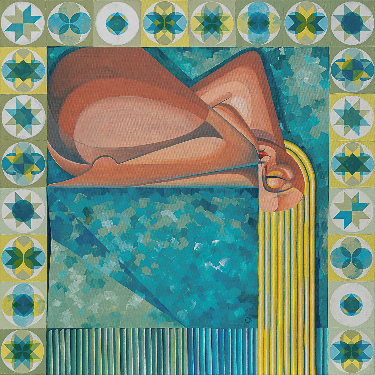 This curiosity manifested explicitly in “Girl in Cultural Frames” (2021) — the first painting where ornamentation became integral. What at first seemed like a distinctly Slavic motif revealed itself to be universal, echoing patterns found in multiple civilizations — a reminder that human cultures mirror one another more than they diverge.
