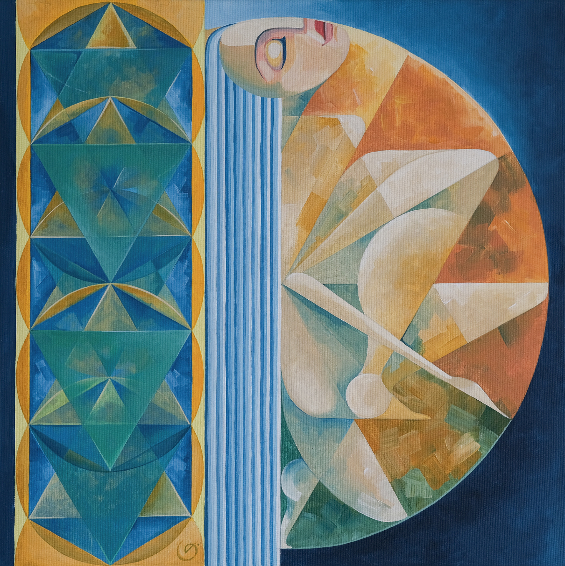 Композиції виникають на перетині цих форм — там, де інтуїтивне відчуття співвідноситься з видимим порядком. Геометрія тут не ілюструє внутрішні стани і не пояснює їх, а слугує способом утримання ідей, памʼяті та досвіду в чіткій структурі.