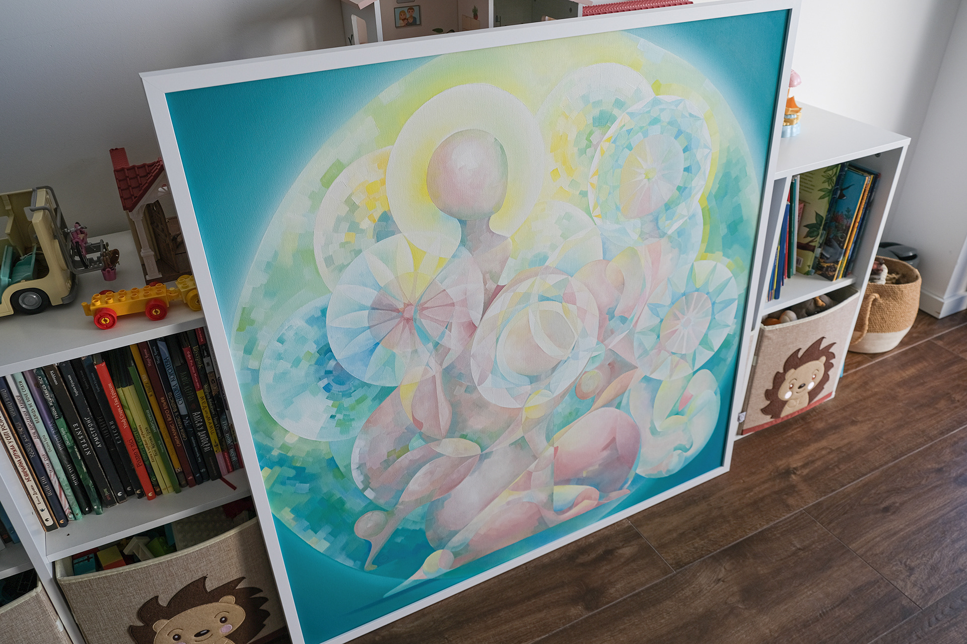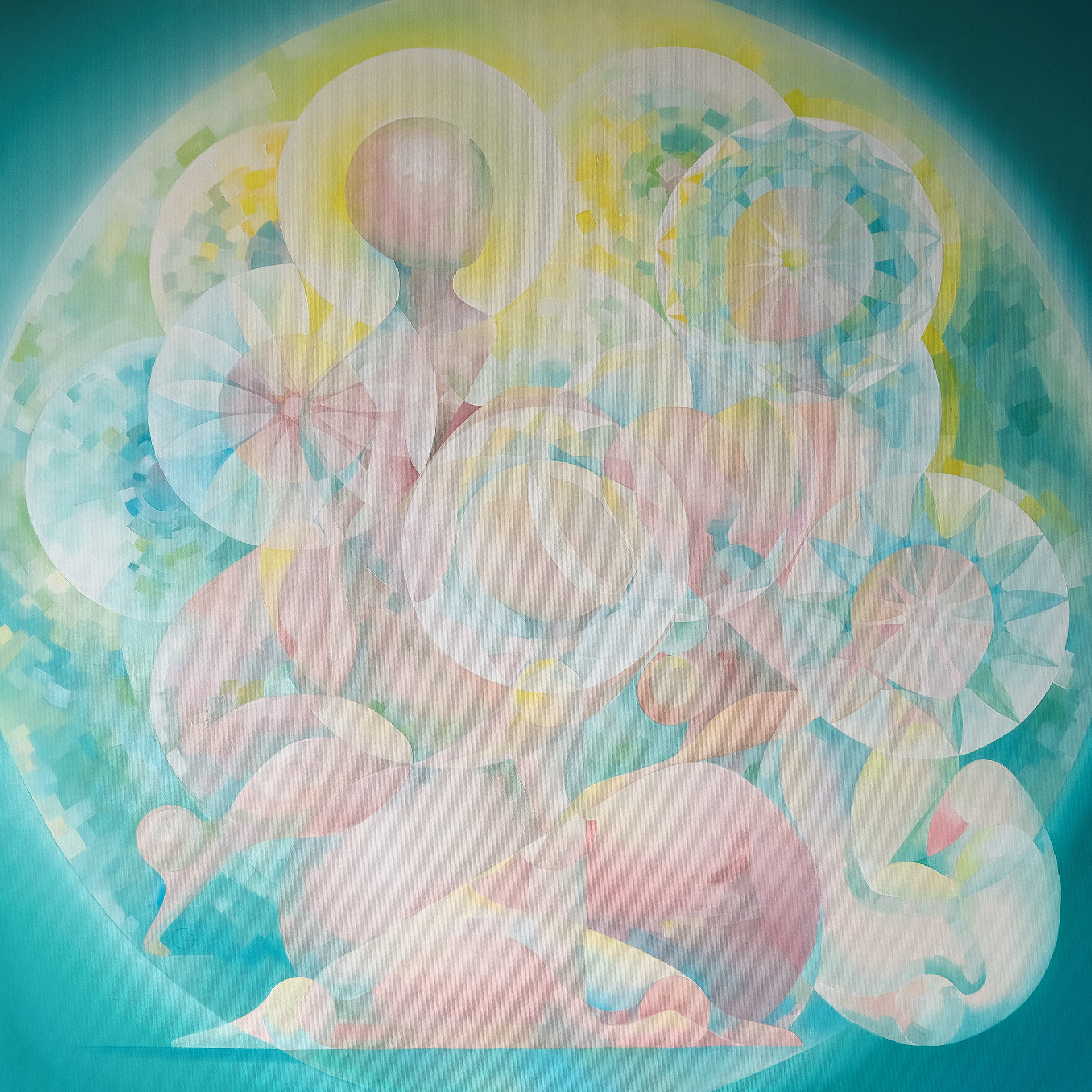 To embody the sacred purity, airiness, fertility, and transience of youth, I chose the image of the dandelion in its “clock” stage — the white, delicate puffball ready to disperse its seeds into the wind. The ornamental halos around the heads of the playful female figures are built by dividing the circle into 8 and 13 parts, echoing the natural geometry of the dandelion head — the crossing of 8 and 13 spirals. Conversation, listening, dreaminess, whispering, and detachment intertwine, weaving a melodic and harmonious pattern of the universe called Youth. The great circle outlines this universe, while the smaller circles symbolize the microcosm each of us carries within.
